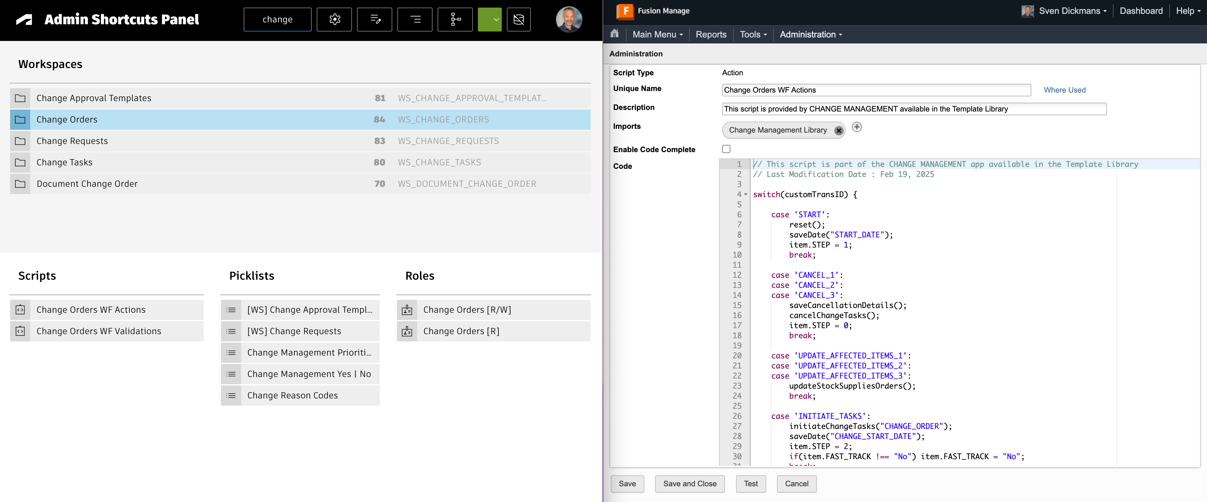 On a single page, this utility provides access to all the workspace manager utilities, but also to all scripts, roles and picklists of your tenant. Clicking the given items will launch the matching utility in PLM. Administrators also can acces the where used information for scripts and pick lists.